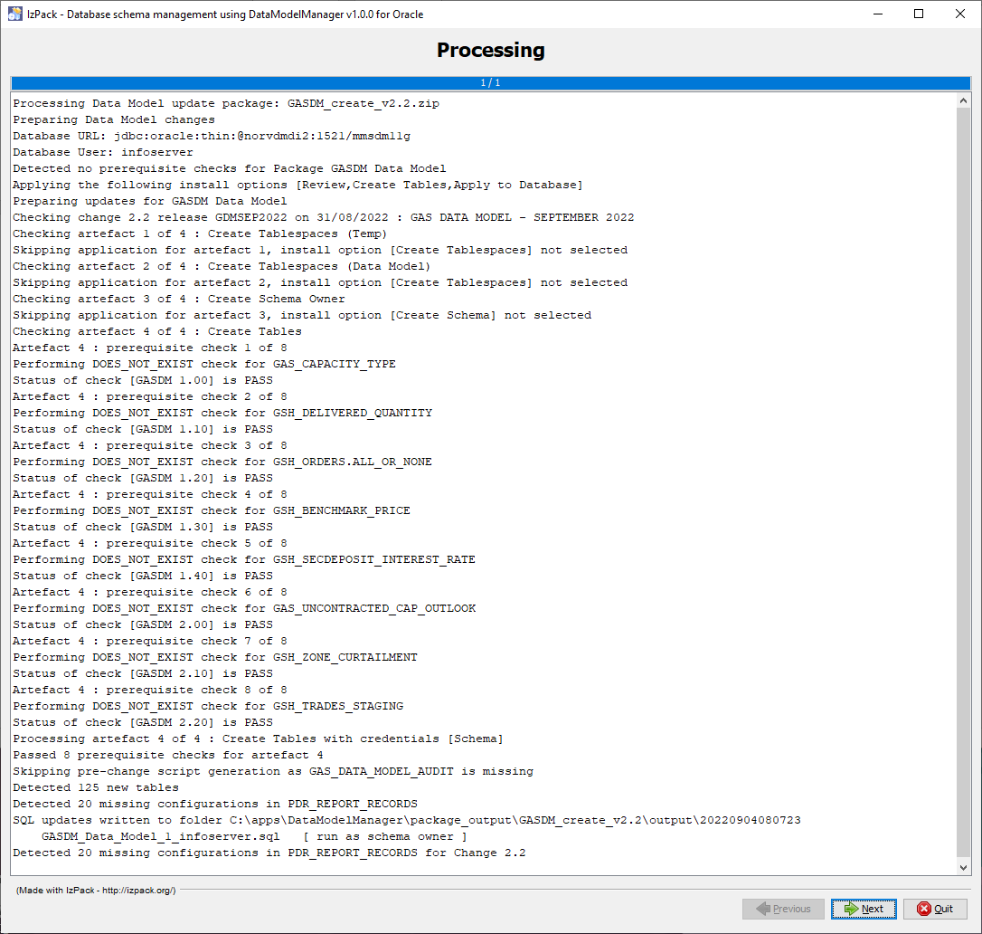 - In the script apply interface, as the script artefacts are applied, the interface displays confirmation of database changes as they are processed. This information is appended to the dataModelManager.log file, ensuring there is a full audit trail of the applied changes. If there are any post installation actions (for example, applying a BASELINE file to populate a newly created table), they display at the end of the installation log. Click Next.