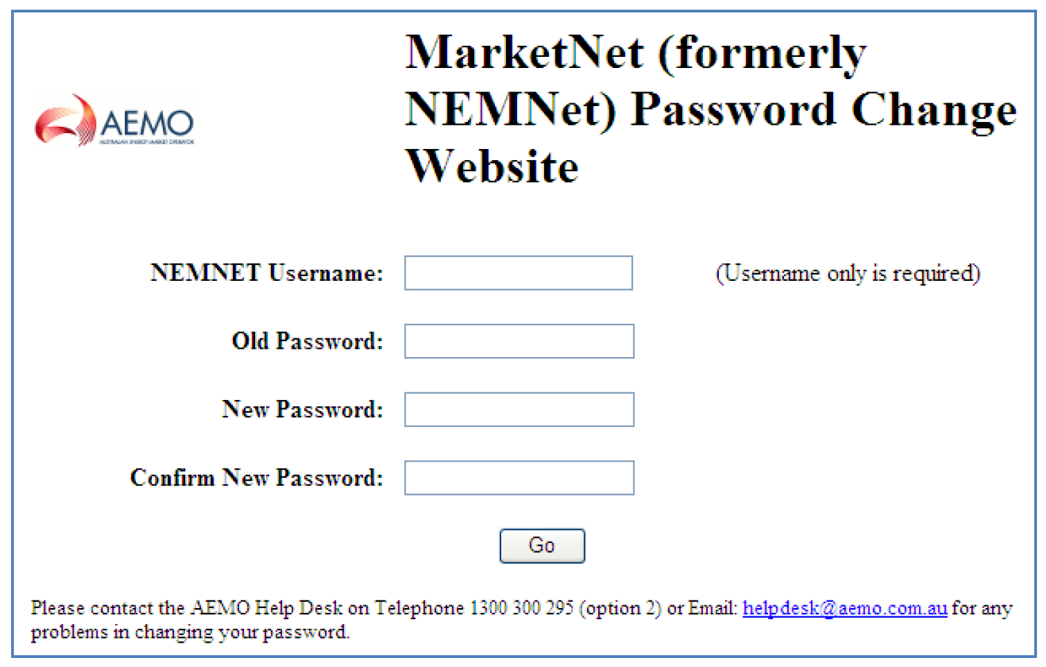 - Click Go to submit the new password. Important: Wait three minutes for the change to take effect on the AEMO server before proceeding.