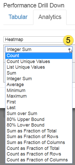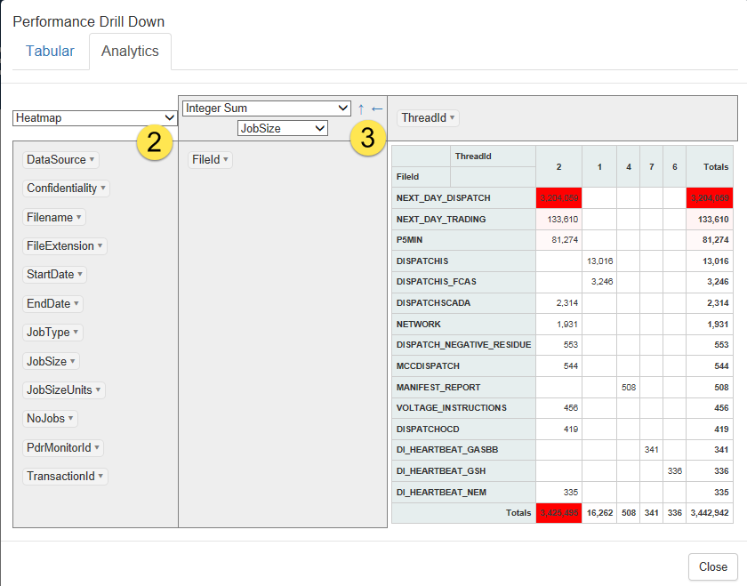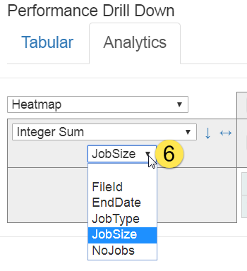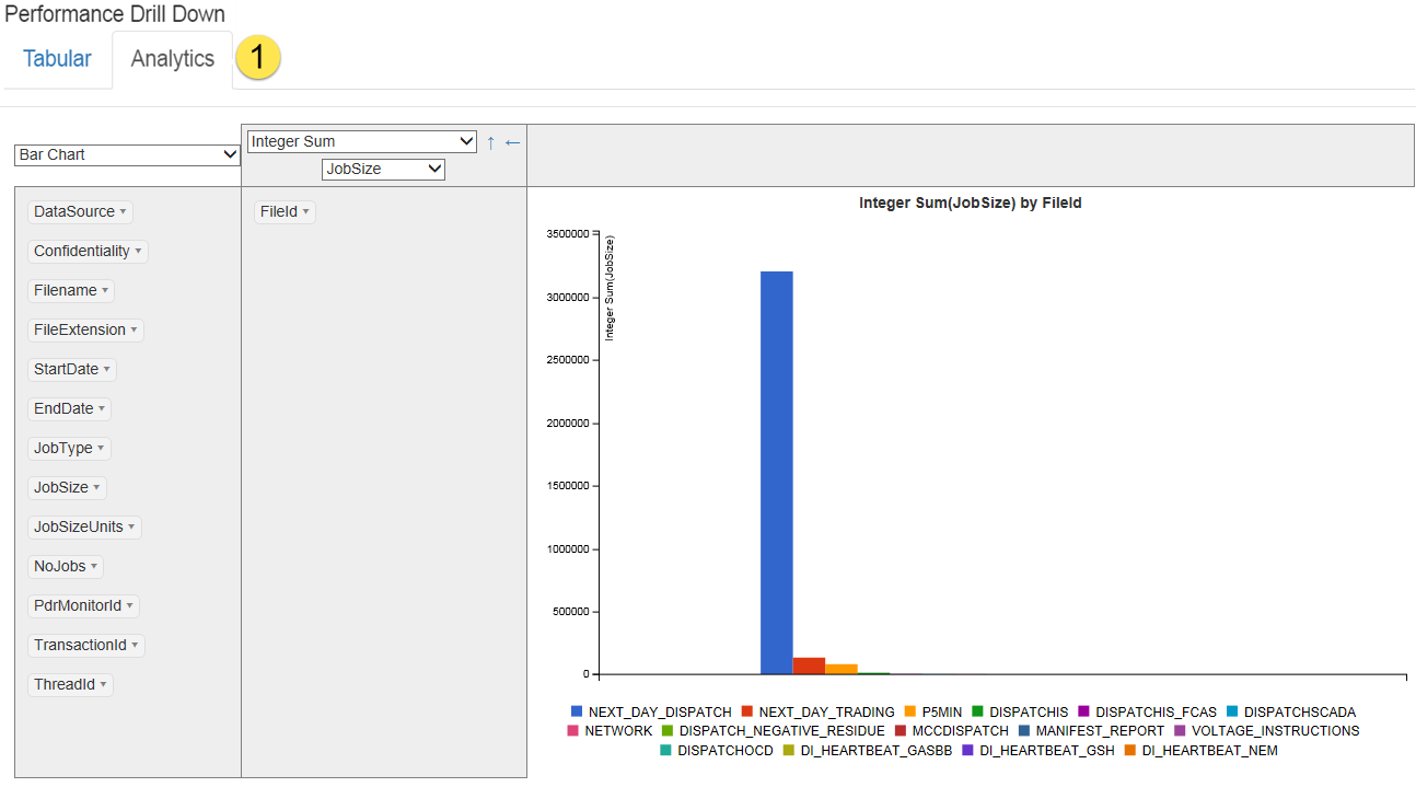 The Analytics tab displays a pivot chart representation of the individual jobs comprising the performance summary.